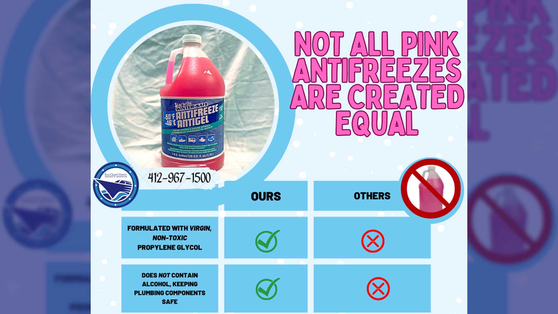 Our Antifreezes are formulated with virgin, non-toxic propylene glycol that does not contain alcohol, keeping your boat’s plumbing components safe!